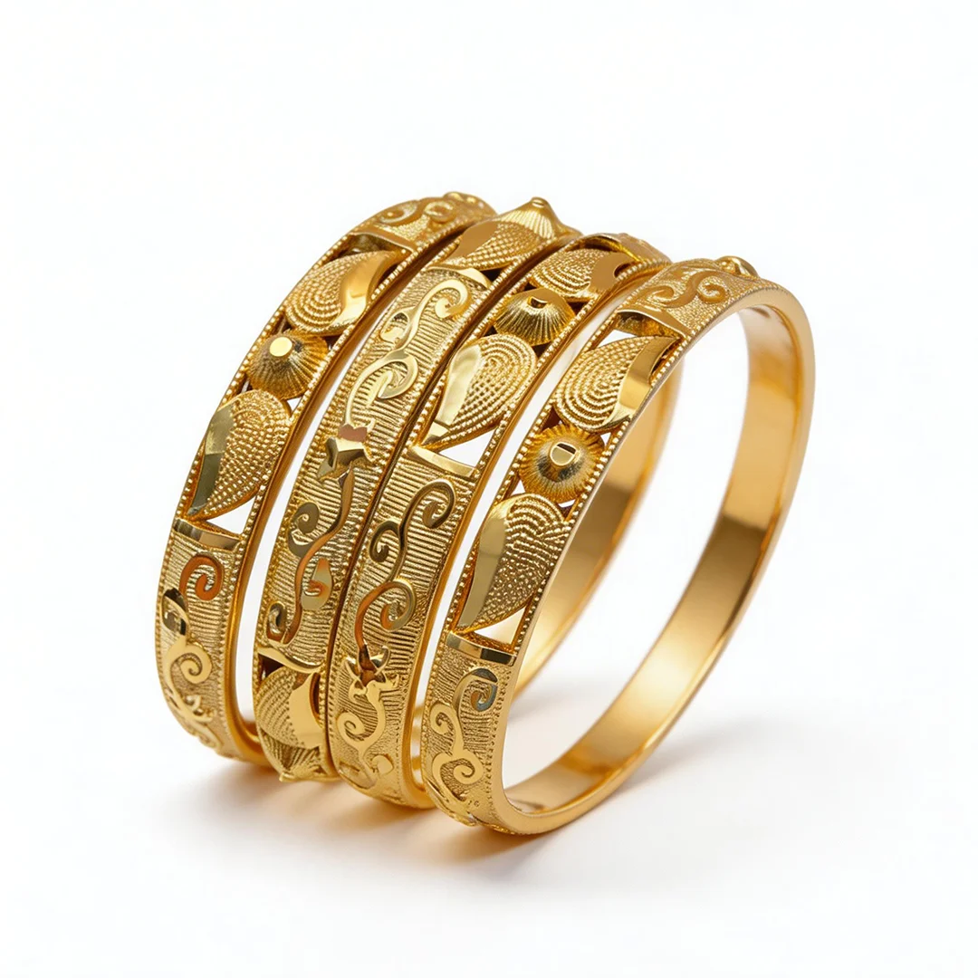 This design features detailed traditional patterns with a textured gold finish that gives a strong and classic appearance. The engraved work and layered textures create a rich look that suits traditional outfits and festive occasions.